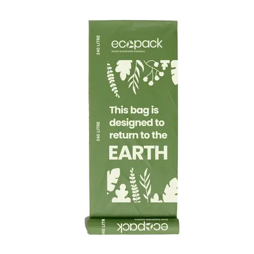 Ecopack 240L compostable bin liners are suited for large wheelie bins and commercial use bins. It is made from natural corn starch and offers an alternative to traditional plastic bags.